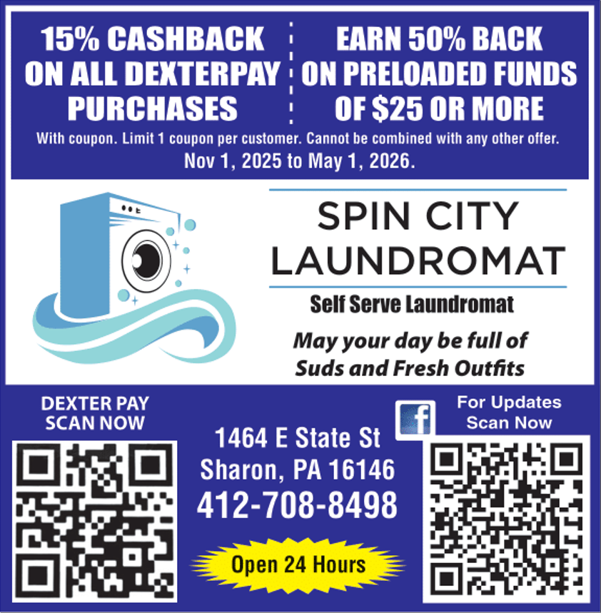 a full-service 24/7 laundromat located on the Main Street in Sharon, PA that serves the Sharon/Mercer community. Proud to be serving our community for more than 47 years.