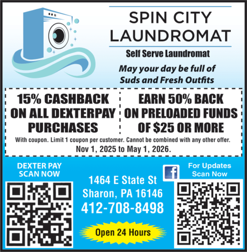 Whether you live in Sharon, Hermitage, Farrell, Wheatland, or nearby, Sharon Laundromat is your convenient “laundromat near me” for everyday laundry, big items, and everything in between.